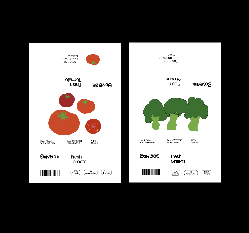 The identity for BonBge captures the lighthearted and playful spirit of an all-day breakfast cafe. A custom hand drawn logo and mouse zodiac sign spired illustrations bring warmth and humour to the brand, while the use of earthy vegetable motifs reinforces freshness and honesty. The system applies across menus, tote bags, packaging, and posters, creating a cohesive yet approachable look. Designed to feel both artisanal and fun, the identity differentiates BonBge from more generic cafes and highlights its focus on Oganic food, and a market-inspired food culture.