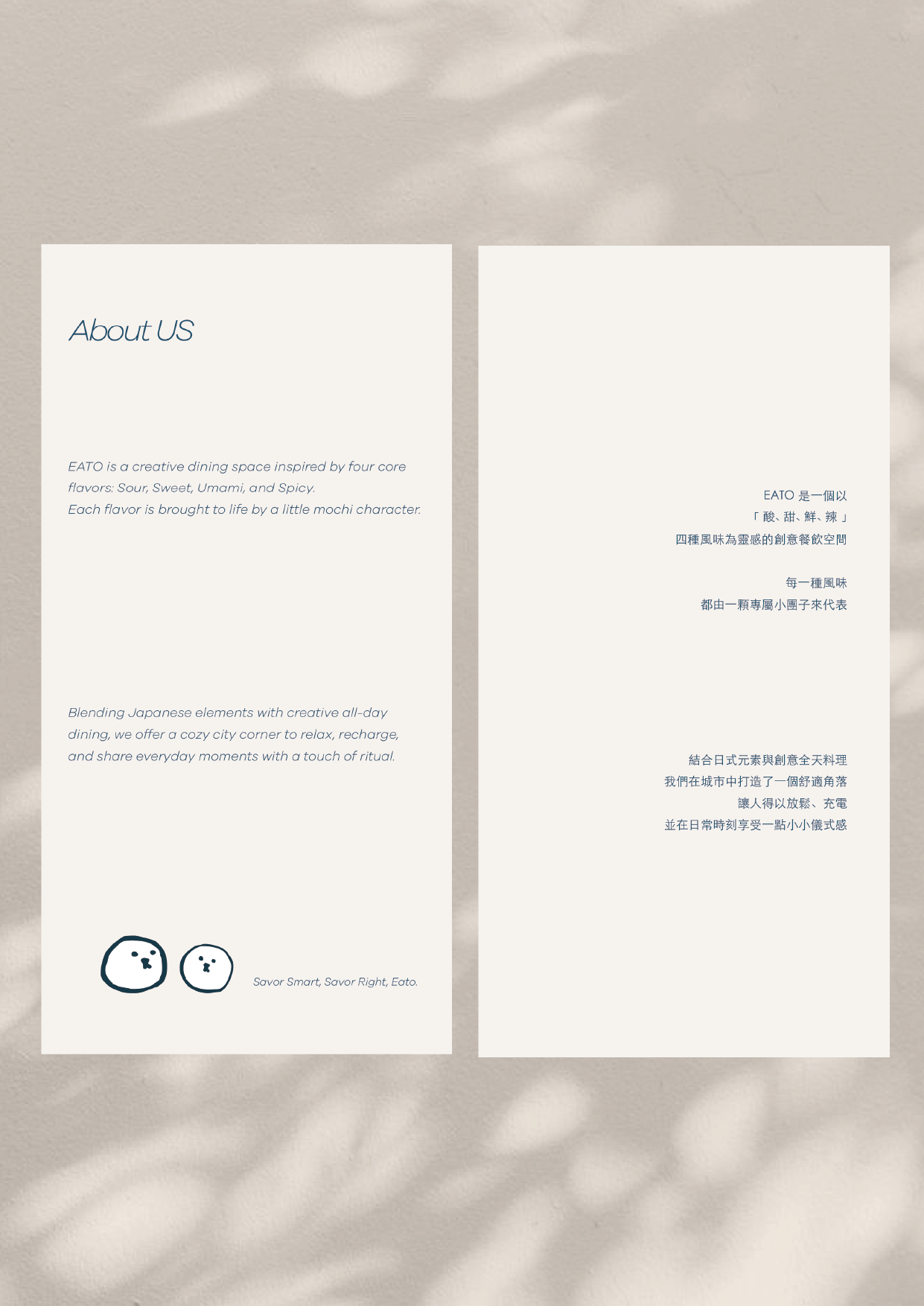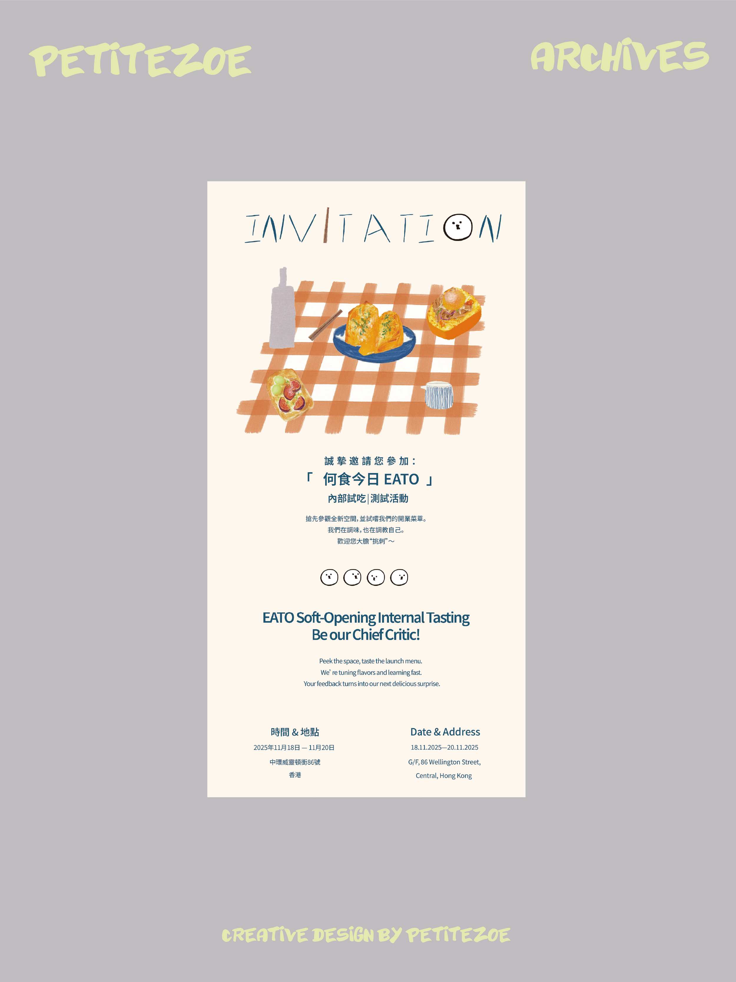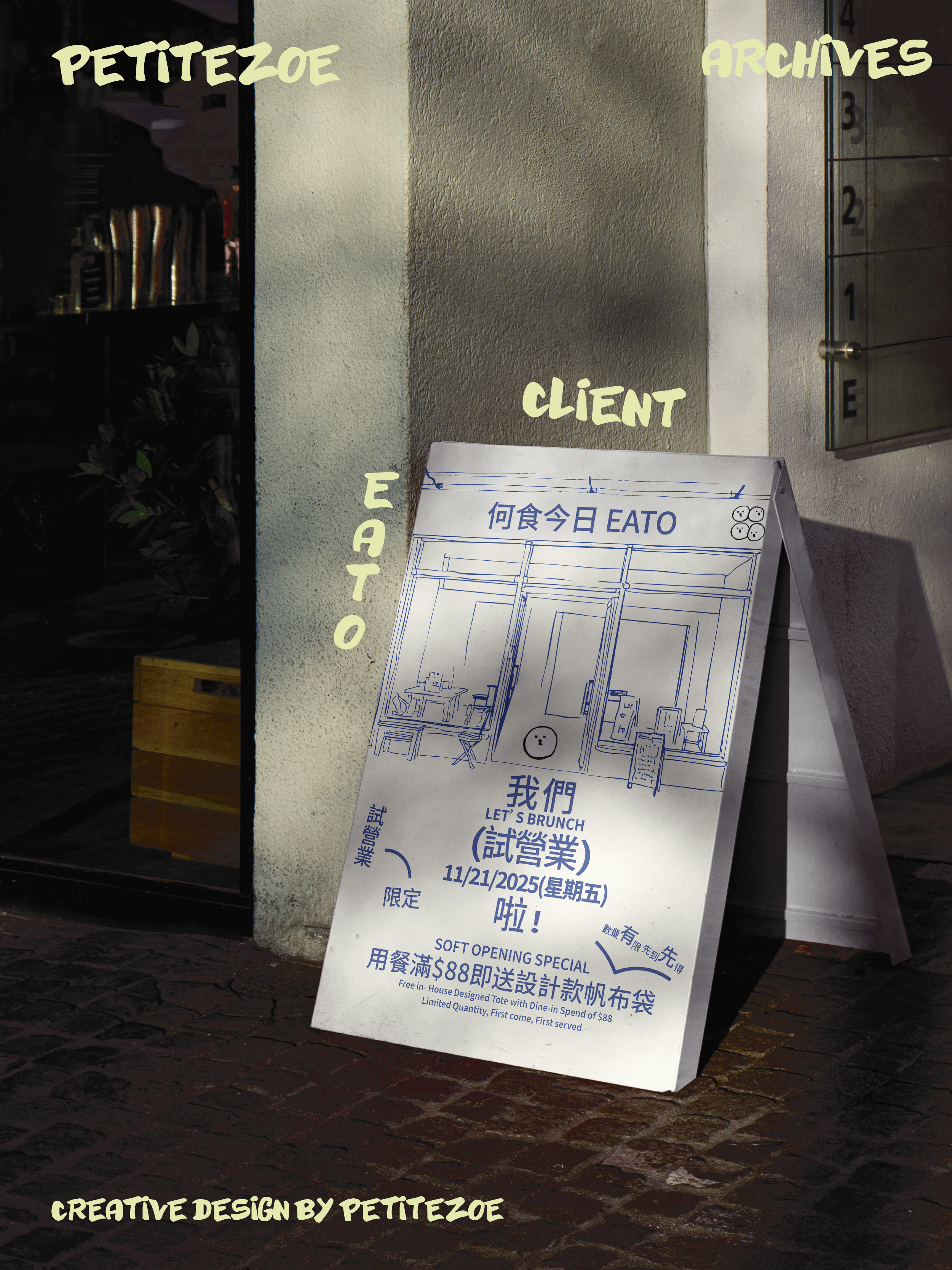 EATO is a contemporary tea-and-dining concept on Wellington Street in Central Hong Kong. Rooted in founder Fiona’s passion for fusion cuisine and Japanese drinking culture, the brand reflects her intuitive understanding of how people gather, unwind and reconnect in a fast-paced city like Hong Kong. As EATO prepared to launch its first location, I developed a visual identity that could articulate Fiona’s vision and support the brand’s long-term growth. Rather than approaching the project as a conventional F&B identity, I positioned EATO as a warm, modular, and culturally attuned dining brand, one that turns everyday meals into small, meaningful moments. Early in the project, one of the key challenges was building a scalable visual system while the menu was still evolving and without extensive food photography. To answer this, I looked directly at the foundation of Fiona’s cuisine: diverse flavours, playful combinations, and the cross-cultural softness that defines her dishes. The IP characters—four subtly expressive “dango faces”—were inspired by four recurring flavour elements in the menu: litsea cubeba, pepper, wheat and chili powder. Each dango represents a taste profile and a character; together, they form a symbolic system that I interpret as three meals a day plus a little sweet moment.
